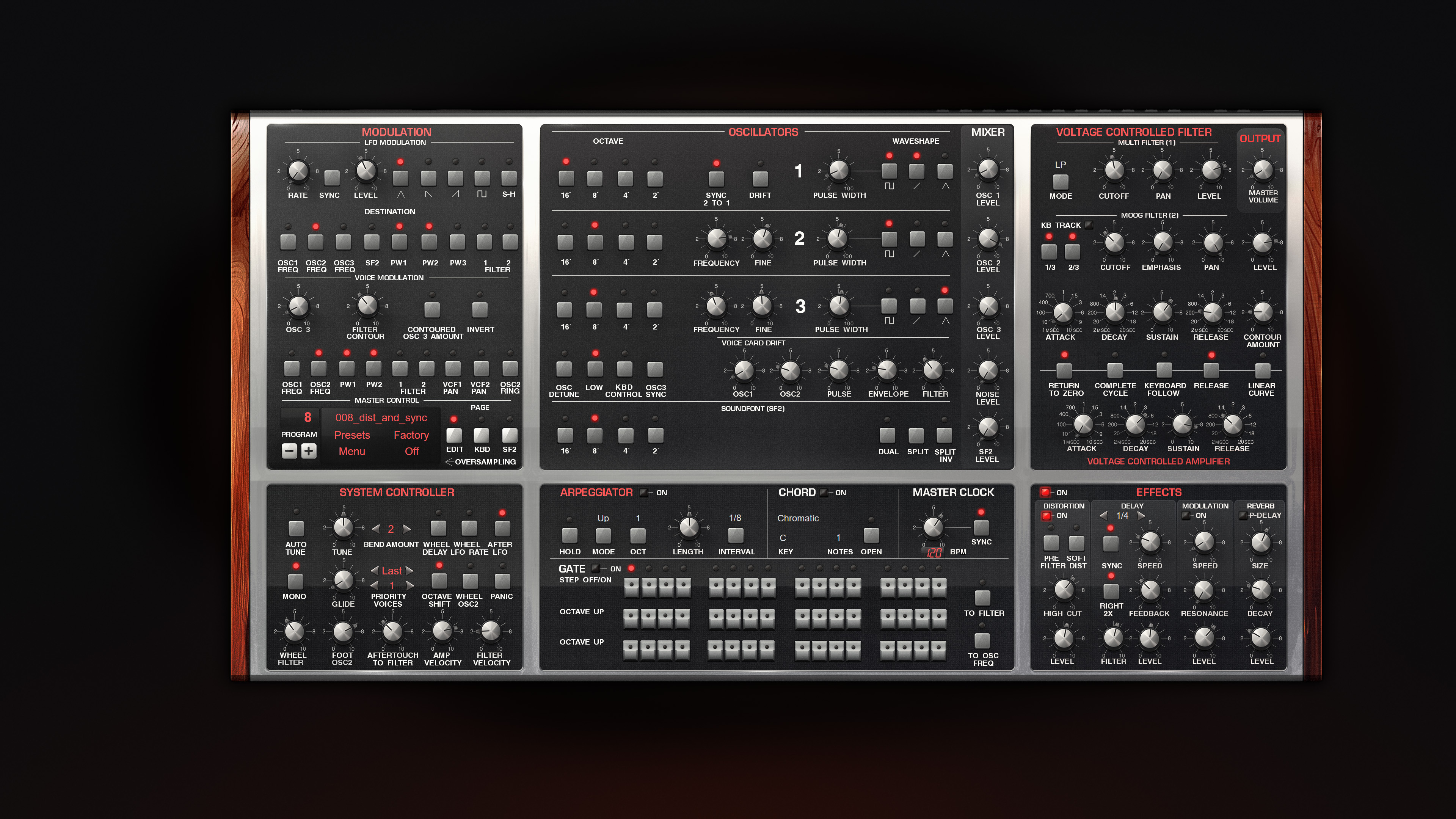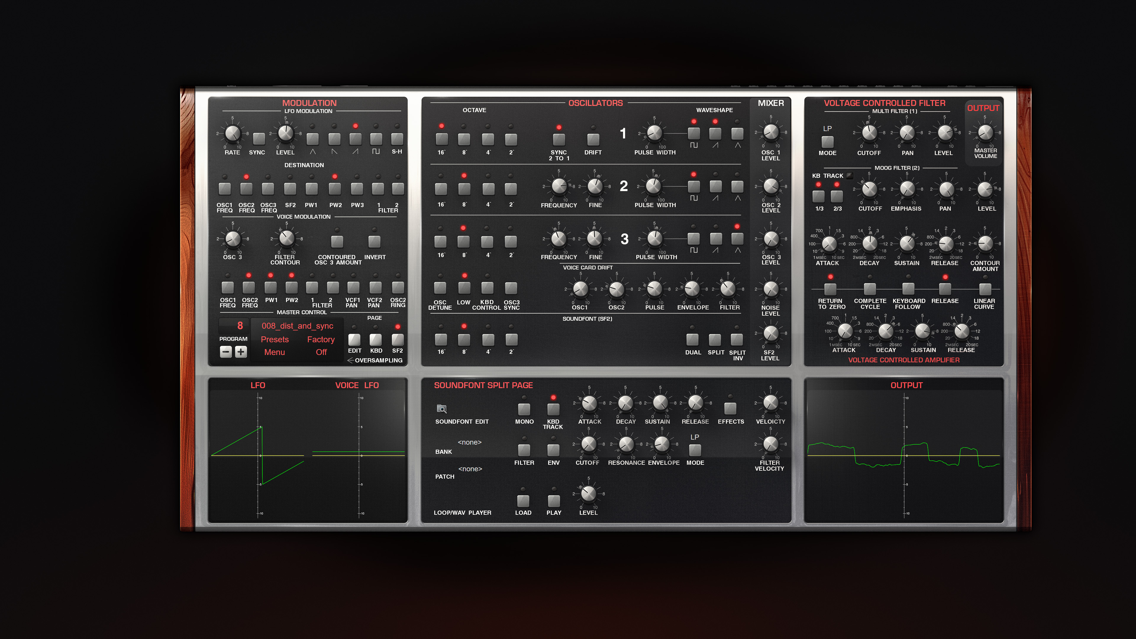 The sound is very overdriven. Mixer levels over 50 will create distortion in all oscillators.